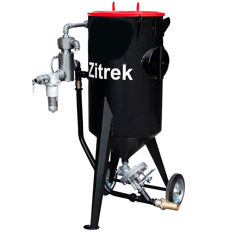 Основой установки является резервуар цилиндроконической формы, установленный на колесную тележку. Установка мобильна и даже при полной загрузке может перемещаться в пределах рабочей площадки. Аппарат Zitrek DSMG-25 отличается объемом загрузочного резервуара, который составляет 25 литров с учетом правила засыпания песка.
